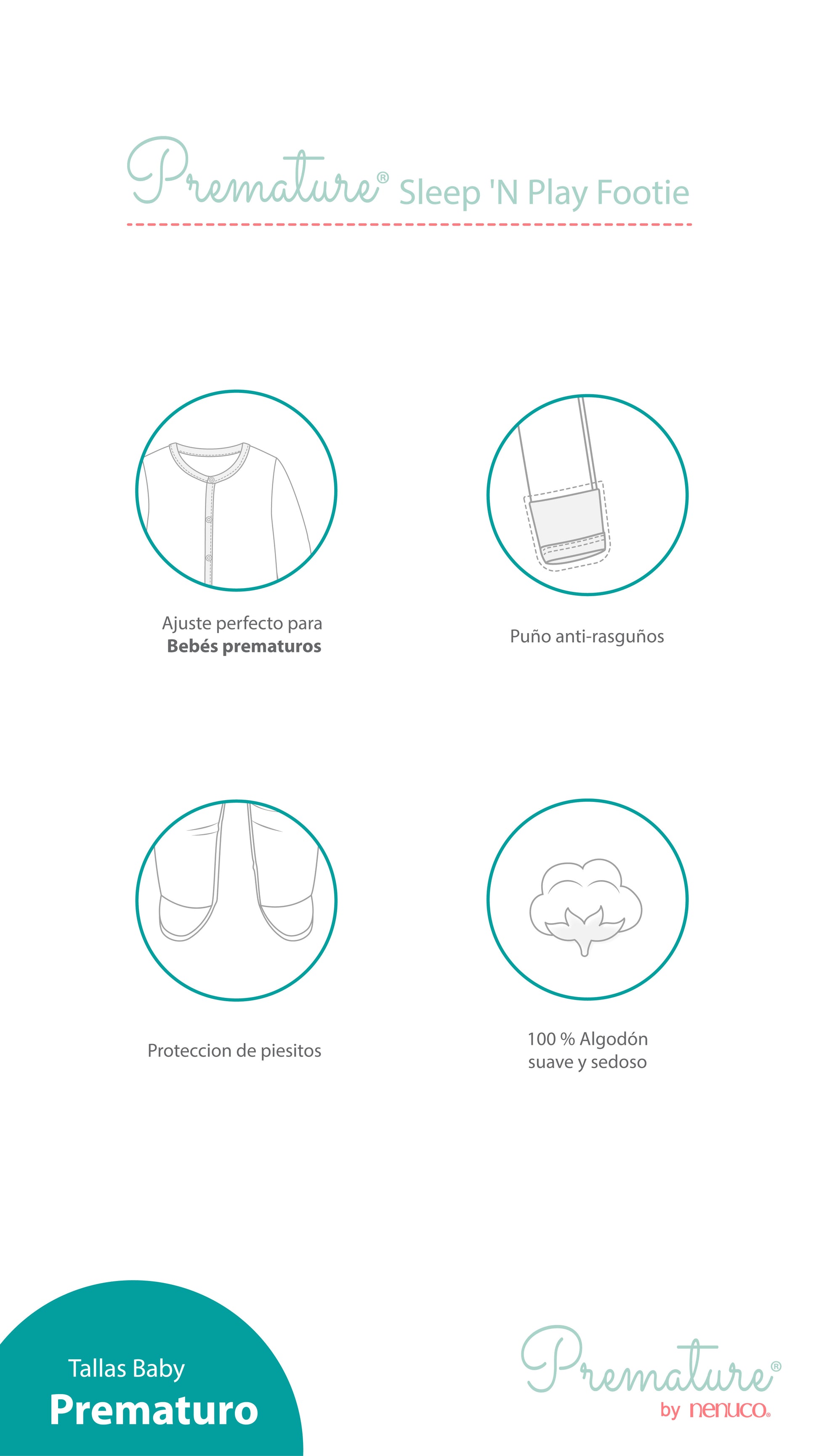 Set 7 piezas, mameluco con guante oculto, pañalero manga larga anti-rasguños, pañalero manga corta, pañalero sin mangas, pantalón con pie, gorro y par de manoplas.